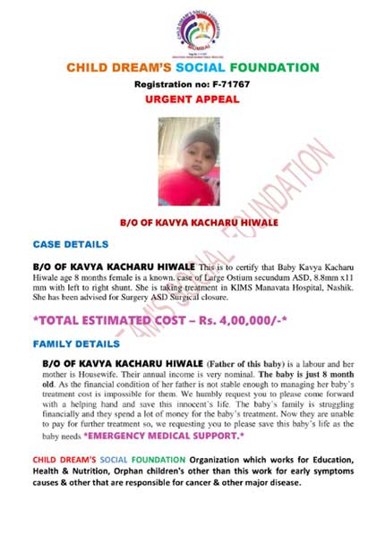 B/O OF KAVYA KACHARU HIWALE (Father of this baby) is a labour and her mother is Housewife. Their annual income is very nominal. The baby is just 8 month old. As the financial condition of her father is not stable enough to managing her baby's treatment cost is impossible for them. We humbly request you to please come forward with a helping hand and save this innocent's life. The baby's family is struggling financially and they spend a lot of money for the baby's treatment. Now they are unable to pay for further treatment so, we requesting you to please save this baby's life as thebaby needs *EMERGENCY MEDICAL SUPPORT.*