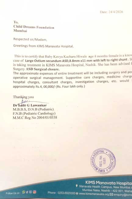 B/O OF KAVYA KACHARU HIWALE This is to certify that Baby Kavya Kacharu Hiwale age 8 months female is a known. case of Large Ostium secundum ASD, 8.8mm x11 mm with left to right shunt. She is taking treatment in KIMS Manavata Hospital, Nashik. She has been advised for Surgery ASD Surgical closure.