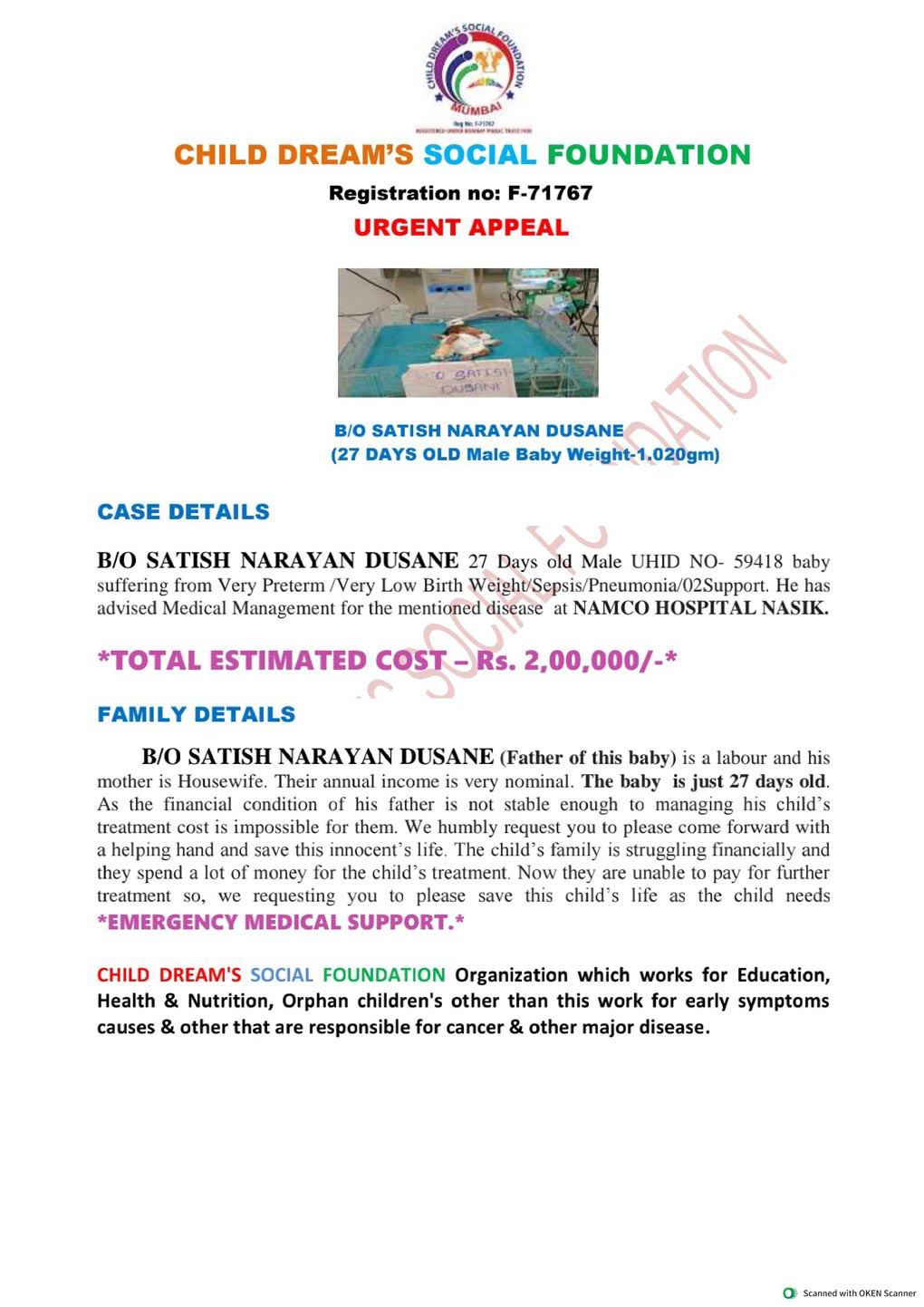 treatment cost is impossible for them. We humbly request you to please come forward with