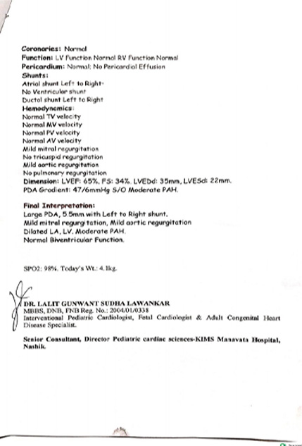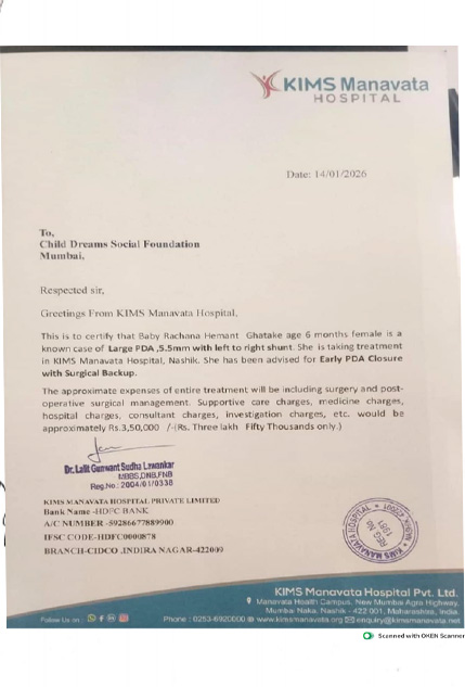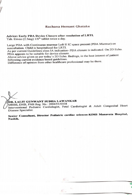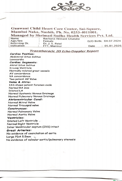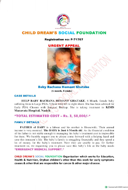 HELP BABY RACHANA HEMANT GHATAKE, 6 Month, female baby suffering from is Large PDA, 5.5mm with left to right shunt. She has been advised for Early PDA Closure with Surgical Backup. She is taking treatment in KIMS Manavata Hospital, Nashik